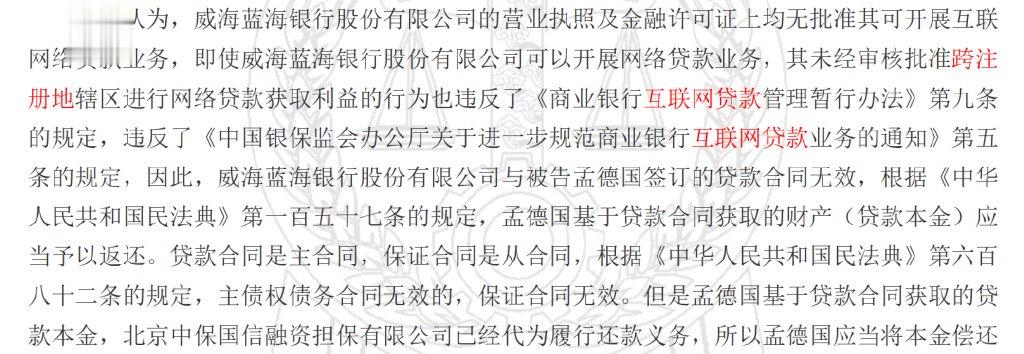 关于本案,法院认为威海蓝海银行股份有限公司的营业执照及金融许可证上均无批准其可开展互联网络贷款业务,即使威海蓝海银行股份有限公司可以开展网络贷款业务,其未经审核批准跨注册地辖区进行网络贷款获取利益的行为也违反了《商业银行互联网贷款管理暂行办法》第九条的规定,违反了《中国银保监会办公厅关于进一步规范商业银行互联网贷款业务的通知》第五条的规定,因此,威海蓝海银行股份有限公司与被告签订的贷款合同无效。