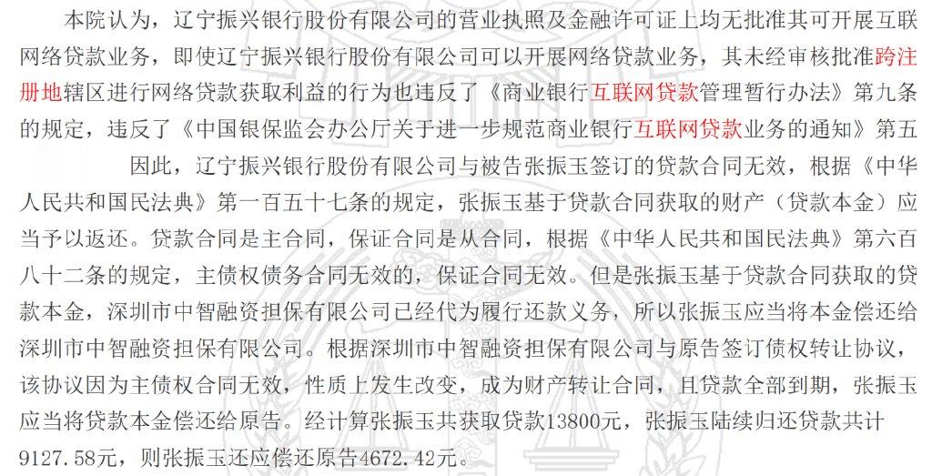 裁判文书网5月29日披露的一则判决书显示,内蒙古自治区牙克石市人民法院也认为辽宁振兴银行股份有限公司的营业执照及金融许可证上均无批准其可开展互联网络贷款业务,即使辽宁振兴银行股份有限公司可以开展网络贷款业务,其未经审核批准跨注册地辖区进行网络贷款获取利益的行为也违反了《商业银行互联网贷款管理暂行办法》第九条的规定,违反了《中国银保监会办公厅关于进一步规范商业银行互联网贷款业务的通知》第五条的规定,因此,辽宁振兴银行股份有限公司与被告签订的贷款合同无效。