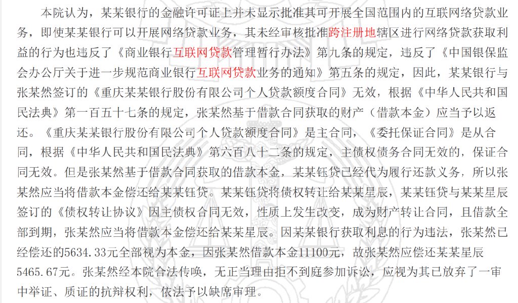 山东省阳谷县人民法院民事判决书亦提及,2023年8月2日,张某然与某某银行在线签订《重庆某某银行股份有限公司个人贷款额度合同》、《重庆某某银行股份有限公司个人贷款借款借据》,约定张某然向某某银行借款11100元。法院认为,某某银行的金融许可证上并未显示批准其可开展全国范围内的互联网络贷款业务,即使某某银行可以开展网络贷款业务,其未经审核批准跨注册地辖区进行网络贷款获取利益的行为也违反了《商业银行互联网贷款管理暂行办法》第九条的规定,违反了《中国银保监会办公厅关于进一步规范商业银行互联网贷款业务的通知》第五条的规定,因此,某某银行与张某然签订的《重庆某某银行股份有限公司个人贷款额度合同》无效。