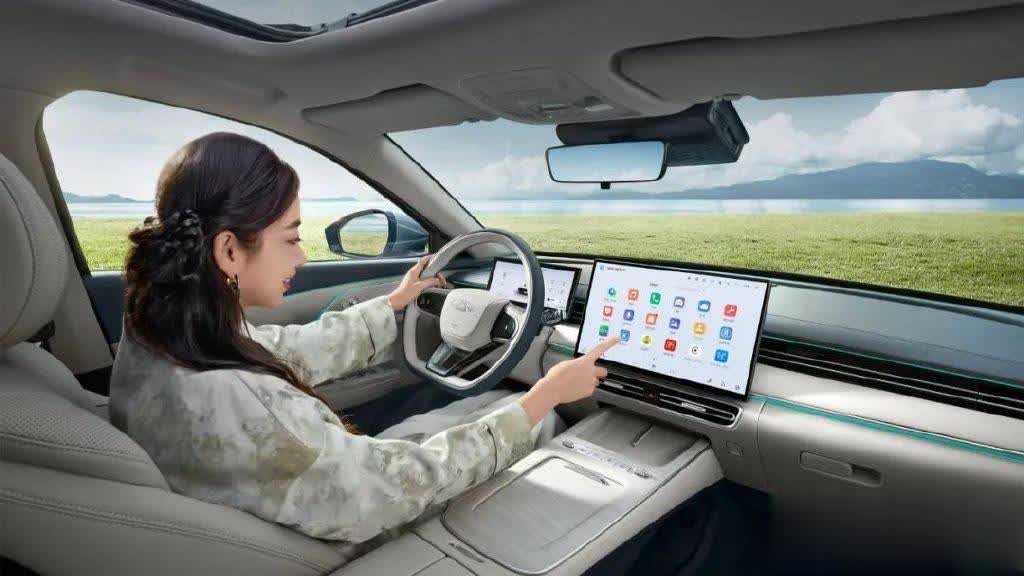 智能化方面,秦L DM-i智驾版配备15.6英寸悬浮式中控屏,搭载智能座舱高阶版-DiLink 100,支持3D控车和地图/壁纸双桌面随心切换。其全场景智能语音支持双音区语音交互,一次唤醒后可多次交互,使用起来非常便捷。丰富的生态资源和车载K歌娱乐系统,可让出行不再单调。