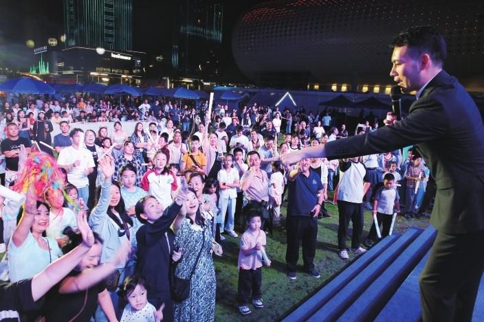 另一侧的互动区里,秀芽精酿IP猴子成为最受欢迎的“明星”。这个憨态可掬的人偶正忙着和小朋友们拍照打卡,摆出各种搞笑造型,引得笑声不断。一旁的工作人员一边为观众拍照一边告诉记者:“现场拍照发朋友圈可以获得光影礼袋,既有趣又有纪念意义,许多孩子特别喜欢。”