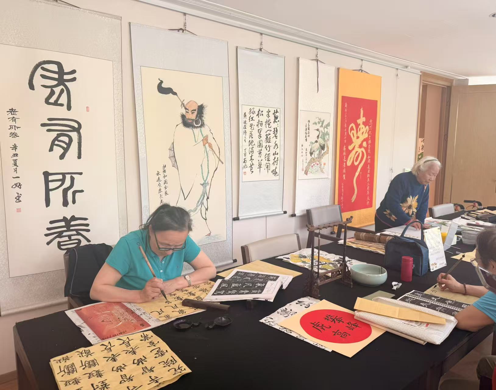 记者在现场看到,除了杨爷爷所在的休憩区,社区公共空间内还有图书馆、棋牌室、书法室、舞蹈室、健身区、健康中心等,大厅里不少老人在伴着音乐跳舞,书法室有老人在专心练字,健身区也有人在智能设备上活动身体,走廊则遍布着老人精心制作的手工艺品、书画作品。