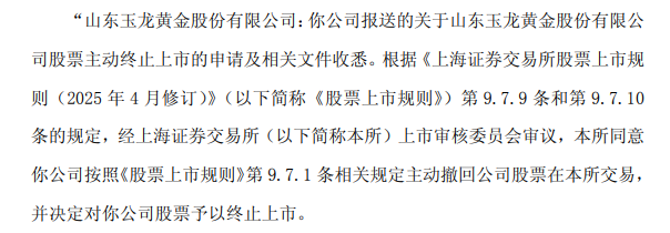 5月20日,玉龙股份(601028)公告称至德投资,公司收到上交所作出的《关于山东玉龙黄金股份有限公司股票终止上市的决定》,决定终止公司股票上市。公司股票将于5月27日终止上市暨摘牌,不进入退市整理期交易。