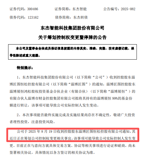 8月19日晚间,东杰智能公告称,公司控股股东淄博匠图恒松控股有限公司(以下简称淄博匠图)正在筹划公司控制权变更事项,可能导致公司实控人发生变更。